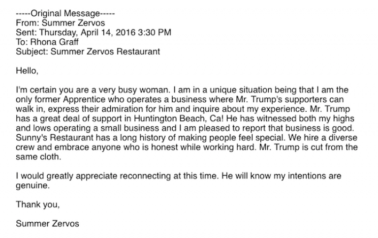 Apparently, months earlier in 2016 Summer Zervos had sent an email with glowing comments against Donald Trump calling him honest and a hard worker: